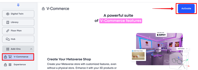 2. After selecting the V-Commerce add-on, you will have the option to activate at the top right corner of the screen: