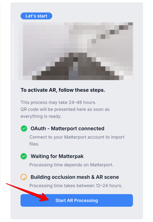 4. Once OAuth is connected and the MatterPak is available, the Augmented Reality add-on will display a blue "Start AR Processing" button. Click this button to begin the conversion.
