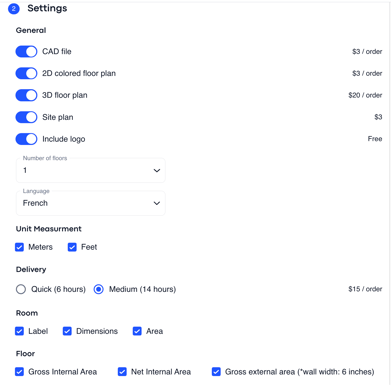 3. Once the type (2D or 3D) is selected, you need to pick the corresponding general settings: style (for 3D plans), unit measurement, delivery of the plan order, rooms and floors settings. The price will be indicated next to each option: