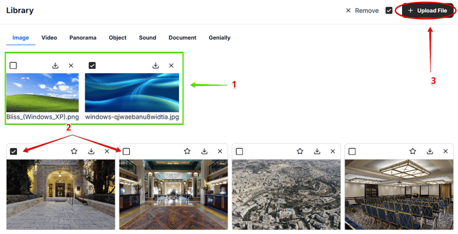 If you choose to upload from the library, you can select images that were previously manually uploaded to the library (1), as well as tour images, automatically pulled from your Matterport photos - by checking the box next to each image (2).