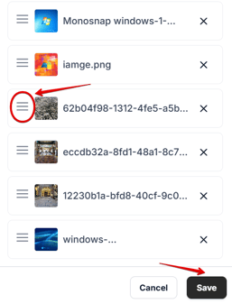 Once your images are imported, you will see a list of the selected items. If needed, you can rearrange their order by dragging and dropping them using the icon with three lines, as shown above. When everything is set, click Save.