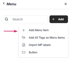 The Gallery action type allows you to visually enrich your Burger Menu by displaying a collection of images in a gallery layout. To get started, click +Add → add new item: