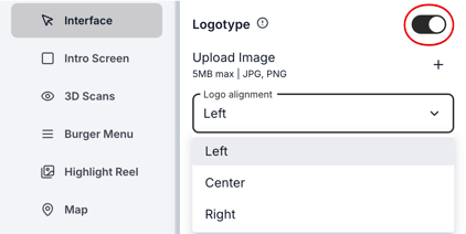 The Logotype option allows you to upload a custom logo and define its alignment within the tour header. You can upload a logo of up to 5 MB and position it on the left, center, or right side at the top of the tour.