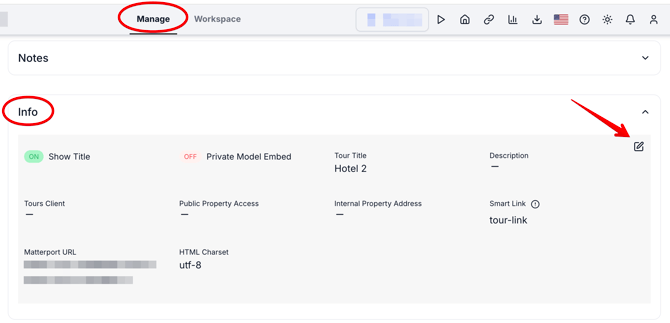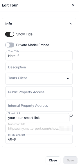 Info is the section that corresponds with basic information about the tour, including adding the tour's title, description, and public property address. Key options include customizing the tour's smart link, assigning the client to the tour, and enabling Private Model Embed for Enterprise users, among others.