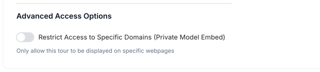- Restrict Access to Specific Domains (Private Model Embed) - limits the tour’s display to specific websites or domains, while preventing unauthorized sharing or embedding elsewhere.