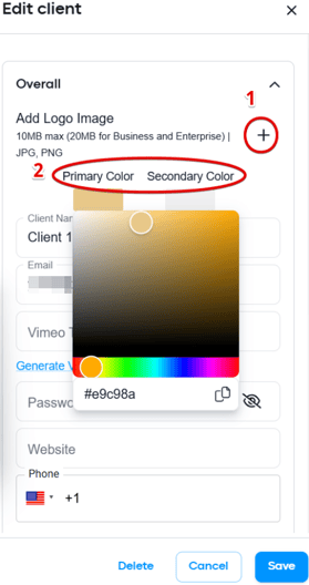 Upload the client’s logo (1) and adjust the colors (2), save the changes: