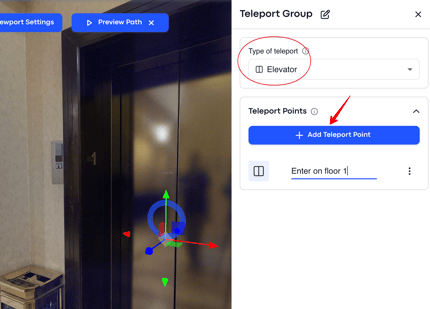 To add a teleport (for either an elevator or stairway), click + Add > select the Teleport group > choose either Stairway or Elevator as the type > click + to place the teleport point in your tour > name the teleport for convenience (optional) > Save.