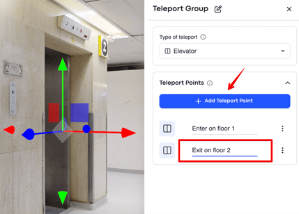 Once you have put the first teleport (e.g. Elevator on floor 1), click on 3 dots next to this teleport group on the admin panel and select Edit. You will be offered to add an additional teleport point for the same group (e.g. Elevator on floor 2). Once added, click Save.