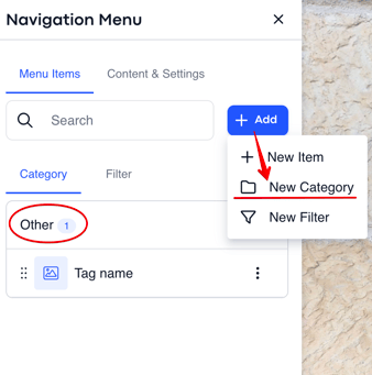 Once the location (tag) is created, it will automatically be placed in the default category "Other". You can also create new categories for your Navigation Menu and classify tags accordingly. To create a different category: click + Add > select New Category.