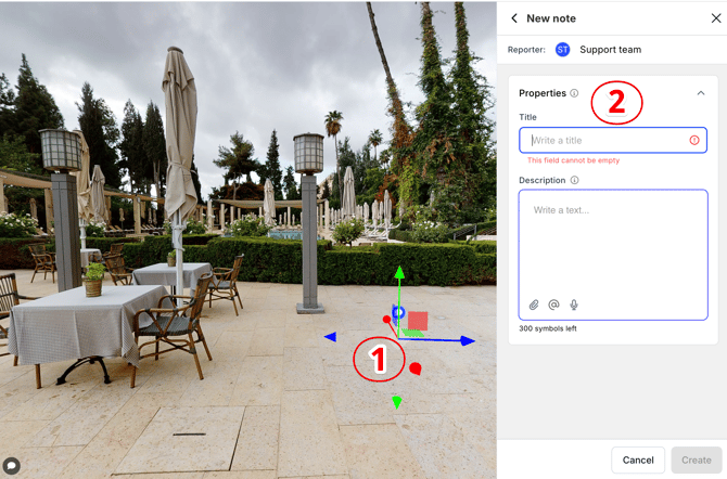 Decide where you want to position the Note within the tour. Once you place the tag (1), you will be given the option to add a title and a comment to the Note (2).