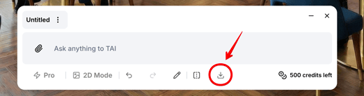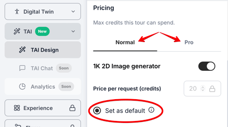 Each time you create a new design or edit a space using the TAI tool, a certain number of credits is consumed. The cost depends on the complexity and resolution of the generated output - whether it is 2D or 360° (Panorama), as well as the selected image quality.