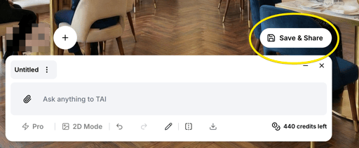 Once activated, a Save & Share option will appear within the TAI interface. By clicking the Save & Share button, you can generate a shareable link to your saved design, which can be distributed to partners and clients for review.