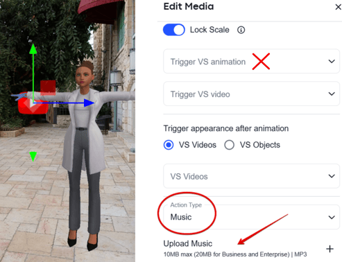 If you'd prefer the Avatar not to appear static when the tour starts, you can add a voiceover differently using the Music action type in the Media settings. The initial steps are the same: firstly go to Virtual Staging to upload VS asset (just Avatar without audio asset) and place it on the space. Then go to Media and upload any image (e.g. play button) > in the image settings select 'Music' action type and upload mp3 file.