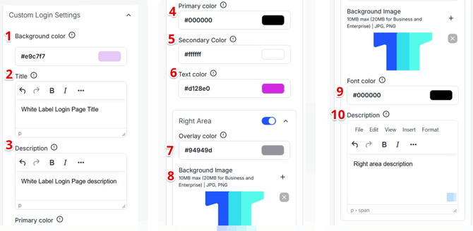 Right Area Description (10) - Add a description or additional text that will appear within the right panel. Formatting options (bold, italic) are available.